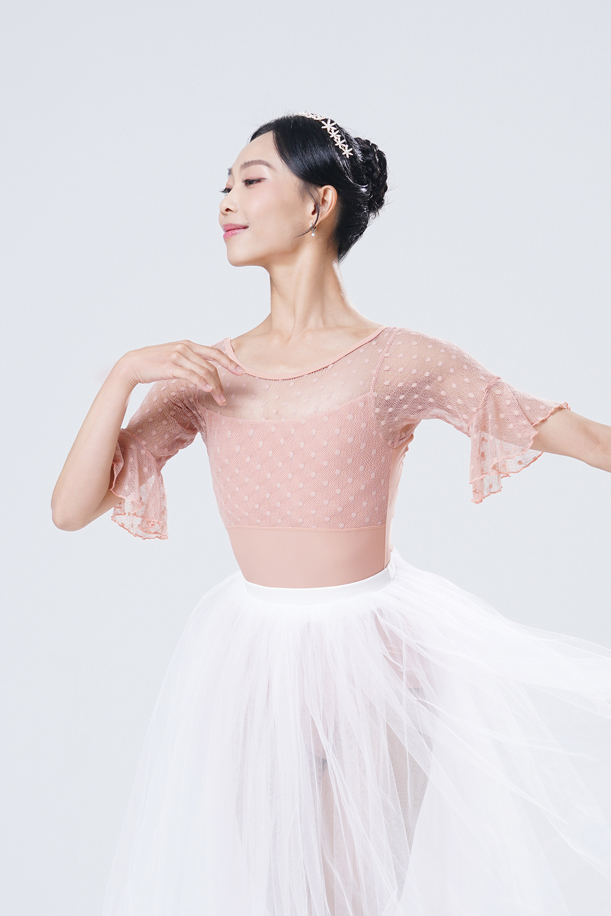 *蕾絲彈性網布包覆著桃心領胸線設計,蕾絲彈性網布延伸成為浪漫袖,法式的迷人典雅展現。