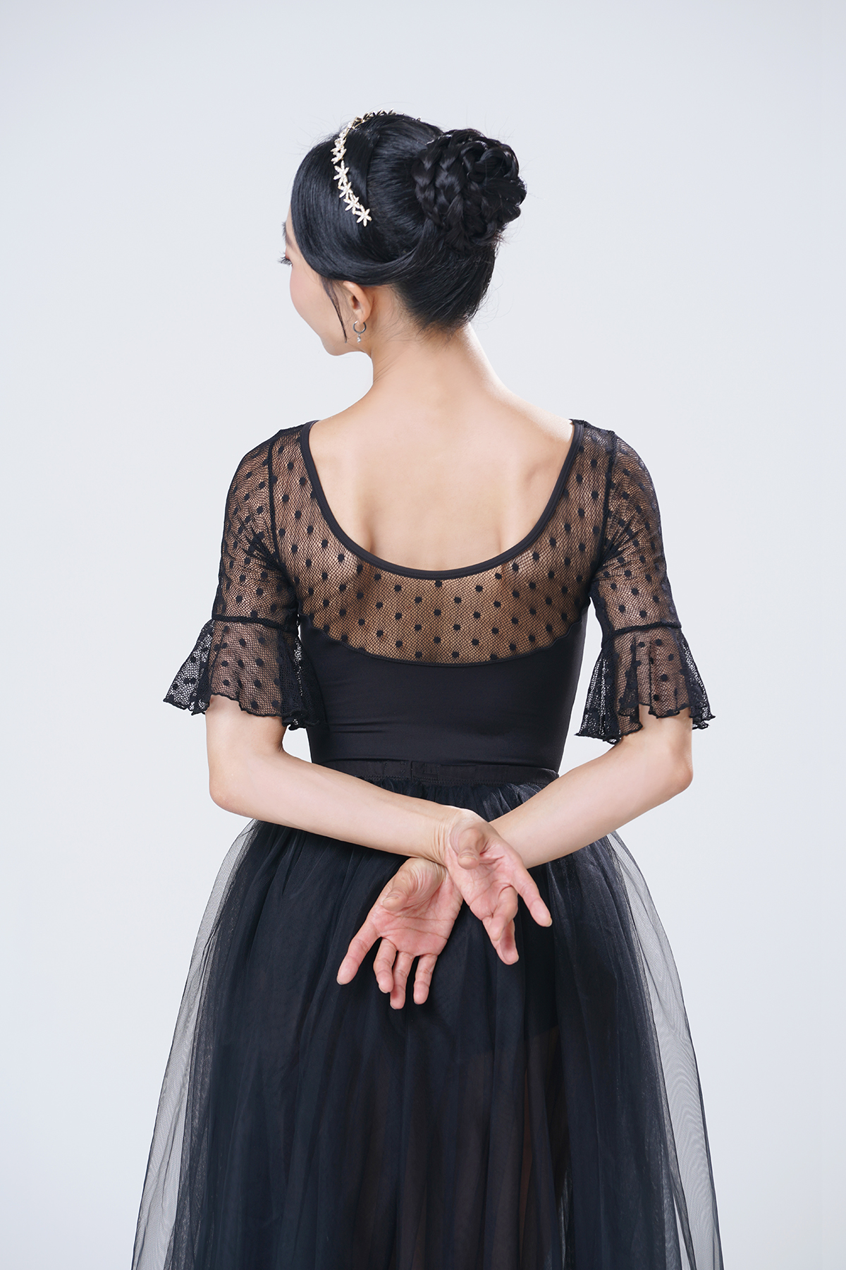 *蕾絲彈性網布包覆著桃心領胸線設計,蕾絲彈性網布延伸成為浪漫袖,法式的迷人典雅展現。