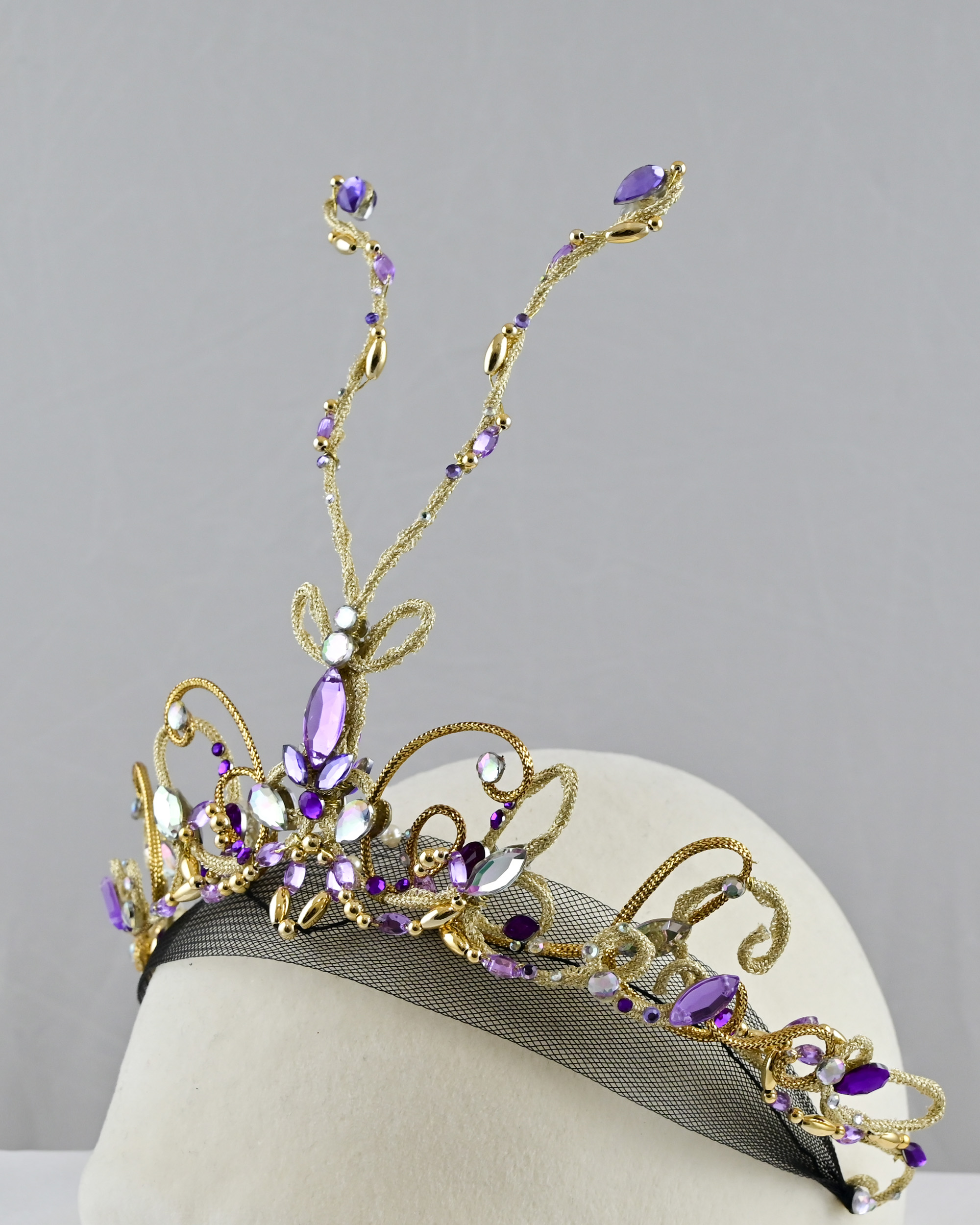 *帶有紫色珠寶與金色紗線、白色珠寶等組合搭配的華麗頭冠。